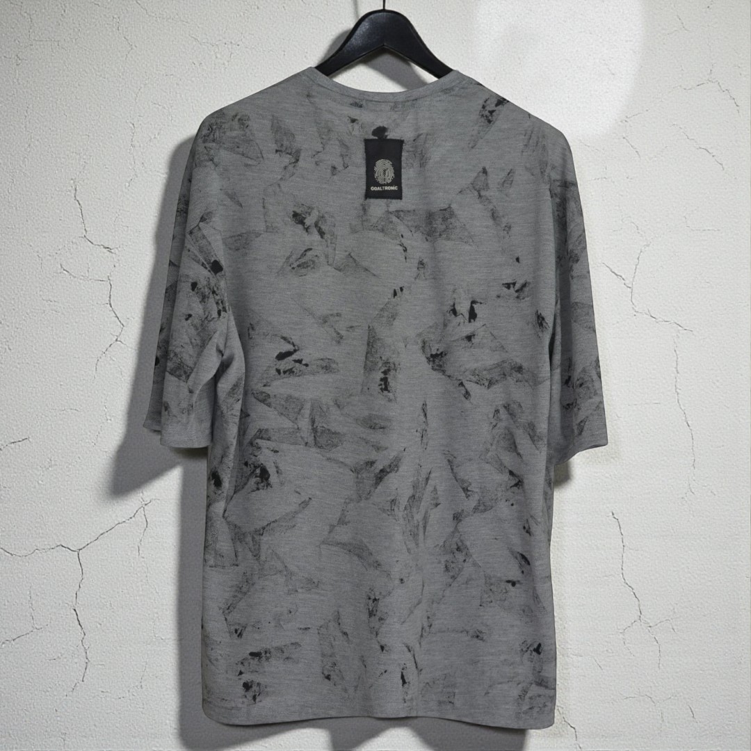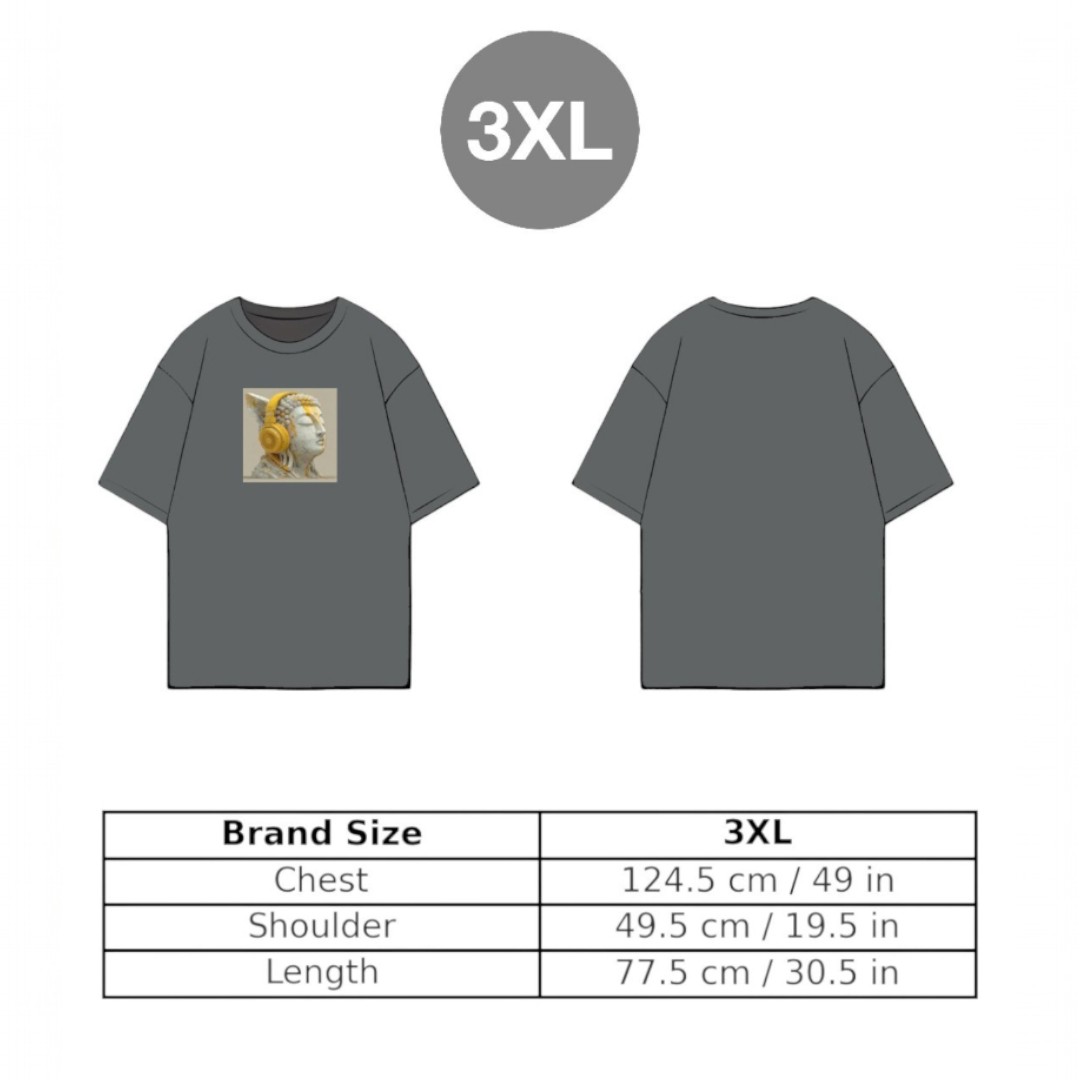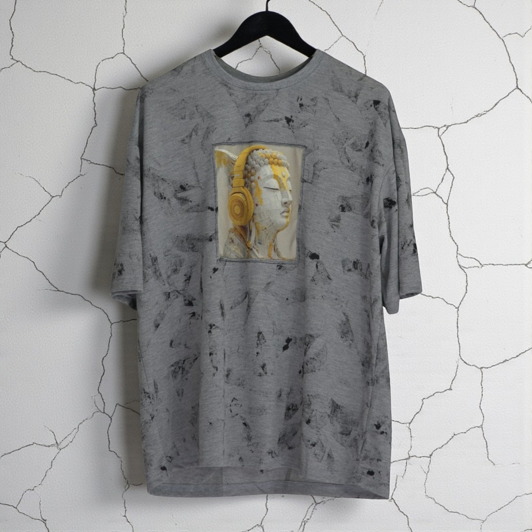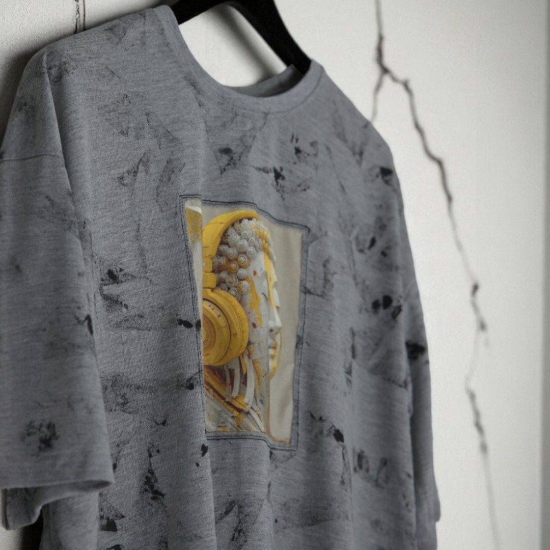 A grey cotton T-shirt, hand-stained with acrylic to create a raw, marble-like texture. At its heart β a digitally printed cat-monk with golden headphones, embodying both playful spirit and meditative calm.